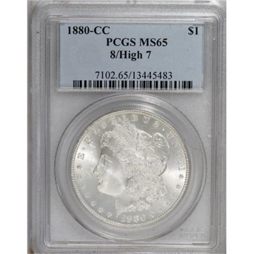 <B>1880-CC $1 8 Over High 7 MS65 PCGS.</B></I> VAM-5. A Top 100 Variety. An obvious 8 over 7 variety with the crossbar, downstroke, base, and "horns" of the 7 visible. Nicely struck and essentially brilliant. The fields are well preserved, while the cheek has only minor grazes.<BR><BR><B>Coin Engraver:</B> George T. Morgan<BR><BR><b>Shipping:</b> Coins & Currency (<a target="_blank" href="http://www.heritageauctions.com/common/shipping.php">view shipping information</a>)