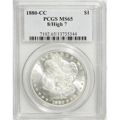 <B>1880-CC $1 8 Over High 7 MS65 PCGS.</B></I> VAM-5. A Top 100 Variety. Wisps of gold toning are noted on the portrait, but this lustrous and splendidly smooth Gem is otherwise brilliant. Liberty's ear exhibits a few trivial roller marks of mint origin, and a small obverse strike-through is seen at 1:30.<BR><I>From The Mario Eller Collection, Part Two.</B></I><BR><BR><B>Coin Engraver:</B> George T. Morgan<BR><BR><b>Shipping:</b> Coins & Currency (<a target="_blank" href="http://www.heritageauctions.com/common/shipping.php">view shipping information</a>)