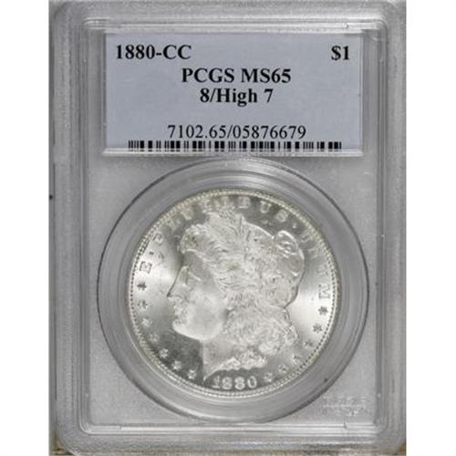 <B>1880-CC $1 8 Over High 7 MS65 PCGS.</B></I> VAM-5. A Top 100 Variety. The underdigit 7 is all too obvious, although there is no hint of a 9 within the 0. A penetratingly struck Gem that has a beautifully smooth reverse and only trivial obverse imperfections.<BR><BR><B>Coin Engraver:</B> George T. Morgan<BR><BR><b>Shipping:</b> Coins & Currency (<a target="_blank" href="http://www.heritageauctions.com/common/shipping.php">view shipping information</a>)