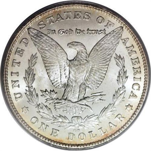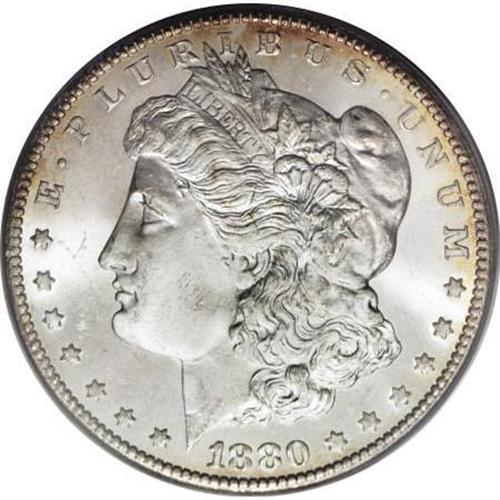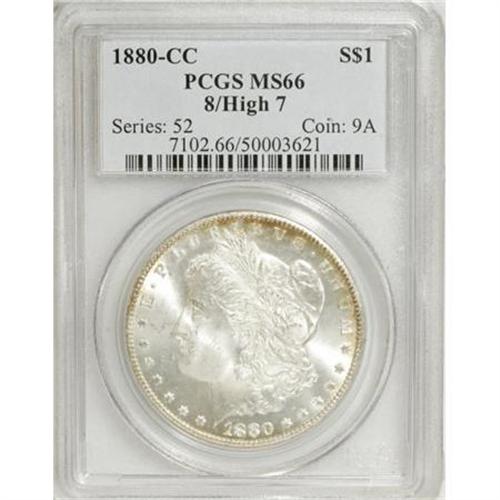 <B>1880-CC $1 8 Over High 7 MS66 PCGS.</B></I> VAM-5. A Top 100 Variety. While a relatively plentiful Carson City issue, the 1880-CC is of interest to collectors because of the variety of overmintmarks available as well as slanting and parallel arrow feathers. This piece has slanting arrow feathers and the underdigit is remarkably strong beneath the second 8. Thick cartwheel luster races around each side of this mostly brilliant example that shows only the slightest touch of golden at the margins.<BR><I>From The Jimmy G. PCGS Registry Collection of Morgan Dollars with Varieties.</B></I><BR><BR><B>Coin Engraver:</B> George T. Morgan<BR><BR><b>Shipping:</b> Coins & Currency (<a target="_blank" href="http://www.heritageauctions.com/common/shipping.php">view shipping information</a>)