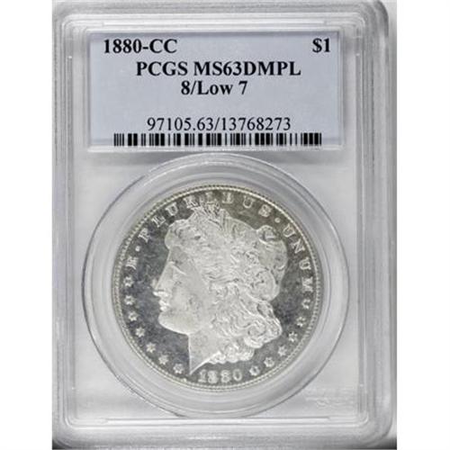 <B>1880-CC $1 8 Over Low 7 MS63 Deep Mirror Prooflike PCGS.</B></I> VAM-6. A Top 100 Variety. Light gold patina visits this flashy and sharply struck CC-mint dollar. The underdigit 7 is obvious, and the devices provide moderate cameo frost.<BR><BR><b>Shipping:</b> Coins & Currency (<a target="_blank" href="http://www.heritageauctions.com/common/shipping.php">view shipping information</a>)