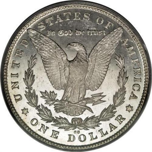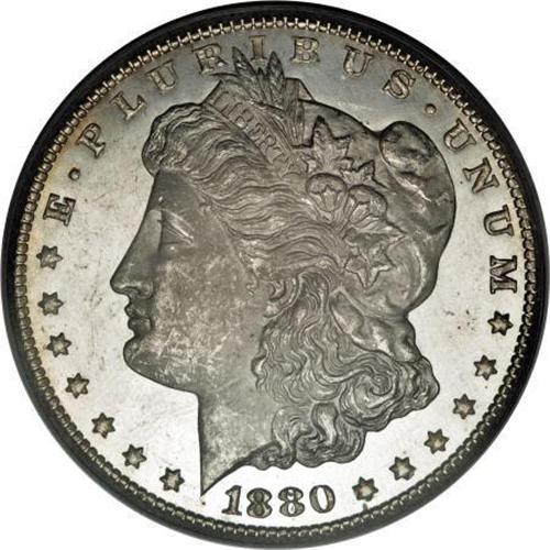 <B>1880-CC $1 8 Over Low 7 MS64 Deep Mirror Prooflike PCGS.</B></I> VAM-6. A Top 100 Variety. Bright surfaces are lightly toned at the margins, and the deeply mirrored fields offer a stunning contrast with the white devices. The design elements are well impressed, save for softness in the hair over Liberty's ear.<BR><BR><b>Shipping:</b> Coins & Currency (<a target="_blank" href="http://www.heritageauctions.com/common/shipping.php">view shipping information</a>)