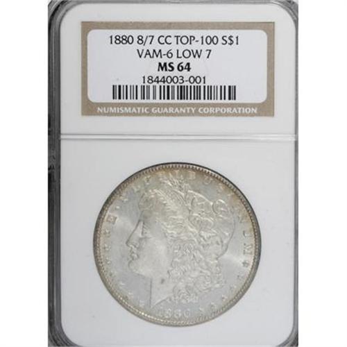 <B>1880-CC $1 8 Over Low 7 MS64 NGC.</B></I> Vam-6 Top-100. NGC Census: (0/0). PCGS Population (184/171). (#7104)<BR><BR><B>Coin Engraver:</B> George T. Morgan<BR><BR><b>Shipping:</b> Coins & Currency (<a target="_blank" href="http://www.heritageauctions.com/common/shipping.php">view shipping information</a>)