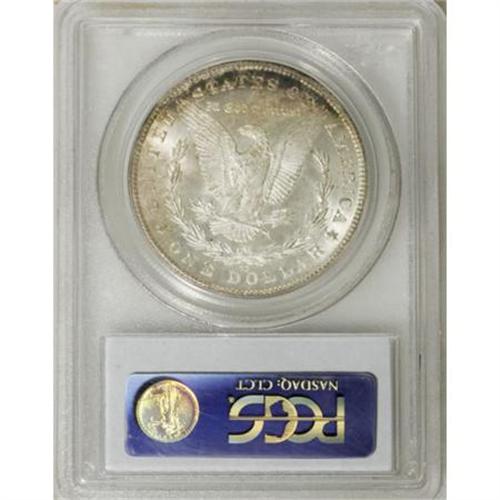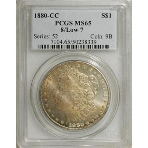<B>1880-CC $1 8 Over Low 7 MS65 PCGS.</B></I> VAM-6. A Top 100 Variety. Orange-gold surfaces on the obverse are accented with cobalt-blue and lavender, while the reverse reveals golden-brown at the left and upper borders. Lustrous, minimally abraded, and suitably struck.<BR><BR><B>Coin Engraver:</B> George T. Morgan<BR><BR><b>Shipping:</b> Coins & Currency (<a target="_blank" href="http://www.heritageauctions.com/common/shipping.php">view shipping information</a>)