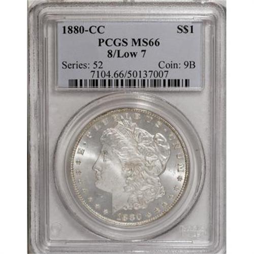 <B>1880-CC $1 8 Over Low 7 MS66 PCGS.</B></I> VAM-6. A Top 100 Variety. A prominent overdate that displays the serifs, crossbar, downstroke, and base of the 7. A boldly impressed Premium Gem that has faint gold toning and exuberant luster. The fields are beautifully preserved, and the cheek has only trivial imperfections. Population: 26 in 66, 0 finer (12/07).<BR><I>From The Jimmy G. PCGS Registry Collection of Morgan Dollars with Varieties.</B></I><BR><BR><B>Coin Engraver:</B> George T. Morgan<BR><BR><b>Shipping:</b> Coins & Currency (<a target="_blank" href="http://www.heritageauctions.com/common/shipping.php">view shipping information</a>)