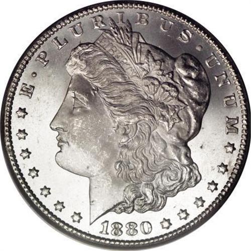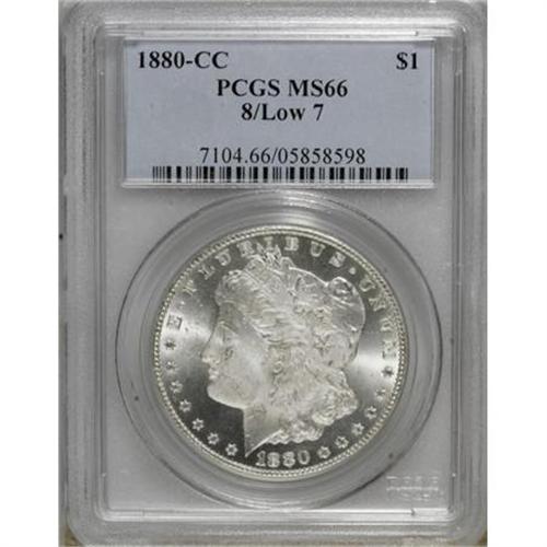 <B>1880-CC $1 8 Over Low 7 MS66 PCGS.</B></I> VAM-6. A Top 100 Variety. A gorgeous Premium Gem with frosty silver luster on both sides. The coin is entirely brilliant with no evidence of toning. Traces of underdate features are evident on this example, as on so many of these coins. This wonderful example will please the connoisseur.<BR><BR><B>Coin Engraver:</B> George T. Morgan<BR><BR><b>Shipping:</b> Coins & Currency (<a target="_blank" href="http://www.heritageauctions.com/common/shipping.php">view shipping information</a>)