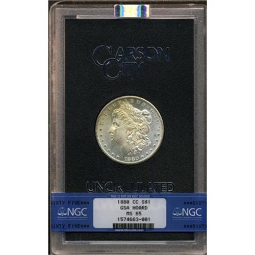 <B>1880-CC $1 8 Over High 7 MS65 NGC.</B></I> VAM-5. A Top 100 Variety. The overdate feature and VAM are undesignated on the NGC label. Well struck for an '80-CC, which often has soft central details. Honey-gold toning dominates the upper left obverse quadrant. This lustrous example has a smooth reverse and an unabraded obverse field.<BR><BR><b>Shipping:</b> Coins & Currency (<a target="_blank" href="http://www.heritageauctions.com/common/shipping.php">view shipping information</a>)
