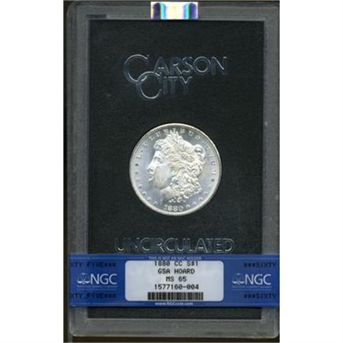 <B>1880-CC $1 MS65 NGC.</B></I> Band-certified in the original holder of issue. Delicate pink and opaque cream patina graces parts of the margins of this frosty Carson City Gem. A crisply struck example that shows only a few scattered luster grazes. Eminently appealing.<BR><BR><B>Coin Engraver:</B> George T. Morgan<BR><BR><b>Shipping:</b> Coins & Currency (<a target="_blank" href="http://www.heritageauctions.com/common/shipping.php">view shipping information</a>)
