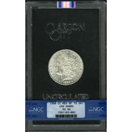 <B>1880-CC $1 MS60 NGC.</B></I> NGC Census: (13/4690). PCGS Population (46/9376). Mintage: 591,000. Numismedia Wsl. Price for NGC/PCGS coin in MS60: $438. (#7100)<BR><BR><B>Coin Engraver:</B> George T. Morgan<BR><BR><b>Shipping:</b> Coins & Currency (<a target="_blank" href="http://www.heritageauctions.com/common/shipping.php">view shipping information</a>)