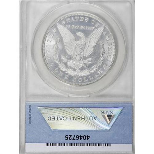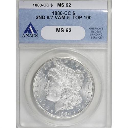 <B>1880-CC $1 2nd 8/7 MS62 ANACS.</B></I> VAM-5. A Top 100 Variety. NGC Census: (366/4354). PCGS Population (848/8465). Mintage: 591,000. Numismedia Wsl. Price for NGC/PCGS coin in MS62: $458. (#7100)<BR><BR><B>Coin Engraver:</B> George T. Morgan<BR><BR><b>Shipping:</b> Coins & Currency (<a target="_blank" href="http://www.heritageauctions.com/common/shipping.php">view shipping information</a>)