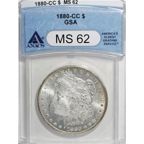 <B>1880-CC $1 MS62 ANACS.</B></I> Ex: GSA. NGC Census: (376/4458). PCGS Population (856/8601). Mintage: 591,000. Numismedia Wsl. Price for NGC/PCGS coin in MS62: $458. (#7100)<BR><BR><B>Coin Engraver:</B> George T. Morgan<BR><BR><b>Shipping:</b> Coins & Currency (<a target="_blank" href="http://www.heritageauctions.com/common/shipping.php">view shipping information</a>)