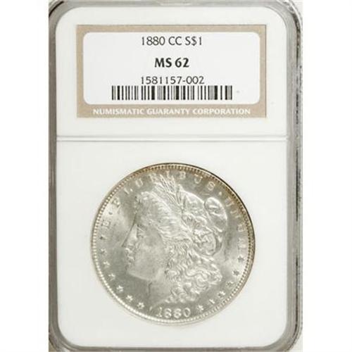 <B>1880-CC $1 MS62 NGC.</B></I> NGC Census: (352/4272). PCGS Population (845/8326). Mintage: 591,000. Numismedia Wsl. Price for NGC/PCGS coin in MS62: $458. (#7100)<BR><BR><B>Coin Engraver:</B> George T. Morgan<BR><BR><b>Shipping:</b> Coins & Currency (<a target="_blank" href="http://www.heritageauctions.com/common/shipping.php">view shipping information</a>)