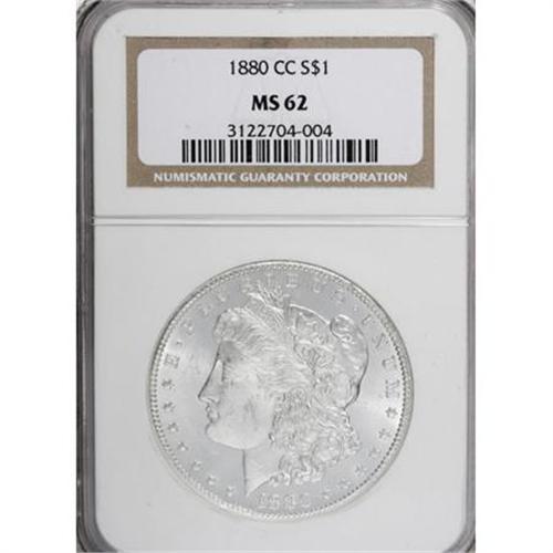 <B>1880-CC $1 MS62 NGC.</B></I> . NGC Census: (371/4396). PCGS Population (850/8506). Mintage: 591,000. Numismedia Wsl. Price for NGC/PCGS coin in MS62: $458. (#7100)<BR><BR><B>Coin Engraver:</B> George T. Morgan<BR><BR><b>Shipping:</b> Coins & Currency (<a target="_blank" href="http://www.heritageauctions.com/common/shipping.php">view shipping information</a>)