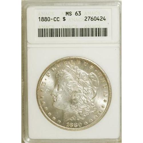 <B>1880-CC $1 MS63 ANACS.</B></I> NGC Census: (1070/3349). PCGS Population (2423/6132). Mintage: 591,000. Numismedia Wsl. Price for NGC/PCGS coin in MS63: $470. (#7100)<BR><BR><B>Coin Engraver:</B> George T. Morgan<BR><BR><b>Shipping:</b> Coins & Currency (<a target="_blank" href="http://www.heritageauctions.com/common/shipping.php">view shipping information</a>)