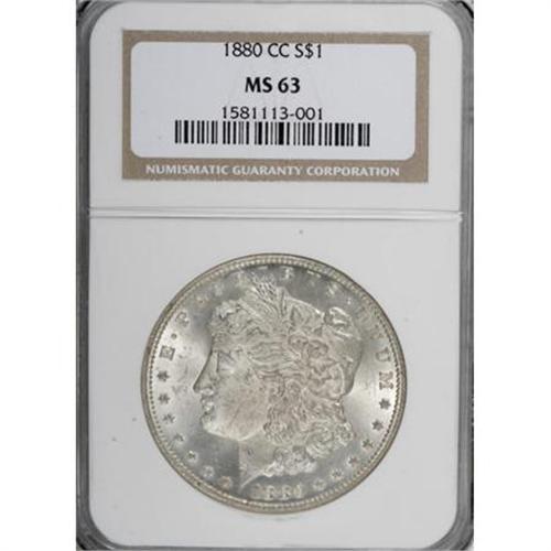 <B>1880-CC $1 MS63 NGC.</B></I> NGC Census: (1023/3249). PCGS Population (2381/5935). Mintage: 591,000. Numismedia Wsl. Price for NGC/PCGS coin in MS63: $470. (#7100)<BR><BR><B>Coin Engraver:</B> George T. Morgan<BR><BR><b>Shipping:</b> Coins & Currency (<a target="_blank" href="http://www.heritageauctions.com/common/shipping.php">view shipping information</a>)