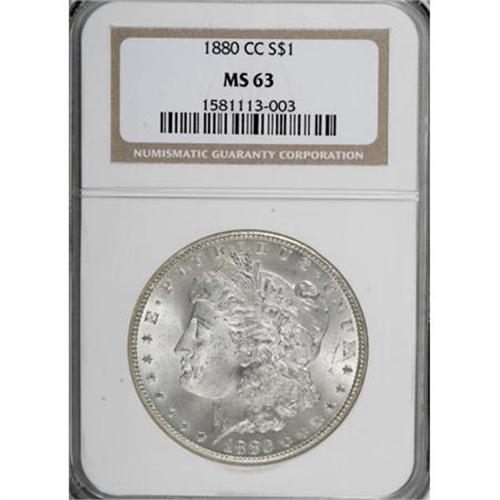 <B>1880-CC $1 MS63 NGC.</B></I> NGC Census: (1023/3249). PCGS Population (2381/5935). Mintage: 591,000. Numismedia Wsl. Price for NGC/PCGS coin in MS63: $470. (#7100)<BR><BR><B>Coin Engraver:</B> George T. Morgan<BR><BR><b>Shipping:</b> Coins & Currency (<a target="_blank" href="http://www.heritageauctions.com/common/shipping.php">view shipping information</a>)