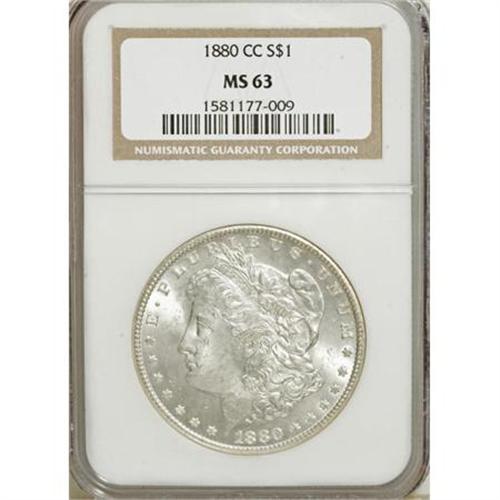<B>1880-CC $1 MS63 NGC.</B></I> NGC Census: (1052/3252). PCGS Population (2399/5997). Mintage: 591,000. Numismedia Wsl. Price for NGC/PCGS coin in MS63: $470. (#7100)<BR><BR><B>Coin Engraver:</B> George T. Morgan<BR><BR><b>Shipping:</b> Coins & Currency (<a target="_blank" href="http://www.heritageauctions.com/common/shipping.php">view shipping information</a>)