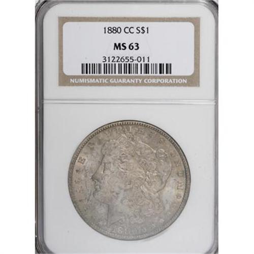<B>1880-CC $1 MS63 NGC.</B></I> . NGC Census: (1063/3322). PCGS Population (2416/6090). Mintage: 591,000. Numismedia Wsl. Price for NGC/PCGS coin in MS63: $470. (#7100)<BR><BR><B>Coin Engraver:</B> George T. Morgan<BR><BR><b>Shipping:</b> Coins & Currency (<a target="_blank" href="http://www.heritageauctions.com/common/shipping.php">view shipping information</a>)