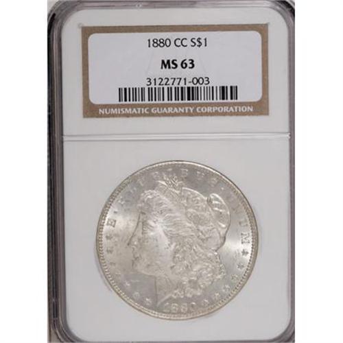 <B>1880-CC $1 MS63 NGC.</B></I> NGC Census: (1072/3354). PCGS Population (2424/6144). Mintage: 591,000. Numismedia Wsl. Price for NGC/PCGS coin in MS63: $470. (#7100)<BR><BR><B>Coin Engraver:</B> George T. Morgan<BR><BR><b>Shipping:</b> Coins & Currency (<a target="_blank" href="http://www.heritageauctions.com/common/shipping.php">view shipping information</a>)