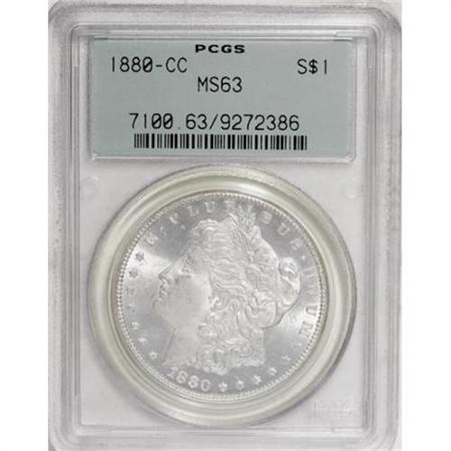 <B>1880-CC $1 MS63 PCGS.</B></I> PCGS Population (2410/6027). NGC Census: (1058/3262). Mintage: 591,000. Numismedia Wsl. Price for NGC/PCGS coin in MS63: $470. (#7100)<BR><BR><B>Coin Engraver:</B> George T. Morgan<BR><BR><b>Shipping:</b> Coins & Currency (<a target="_blank" href="http://www.heritageauctions.com/common/shipping.php">view shipping information</a>)