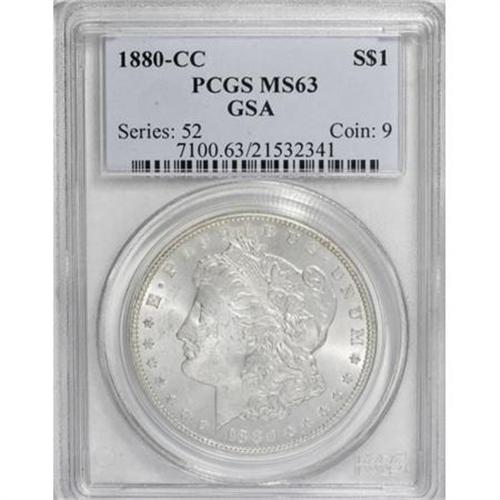 <B>1880-CC $1 MS63 PCGS.</B></I> Ex:GSA. PCGS Population (2416/6090). NGC Census: (1065/3331). Mintage: 591,000. Numismedia Wsl. Price for NGC/PCGS coin in MS63: $470. (#7100)<BR><BR><B>Coin Engraver:</B> George T. Morgan<BR><BR><b>Shipping:</b> Coins & Currency (<a target="_blank" href="http://www.heritageauctions.com/common/shipping.php">view shipping information</a>)