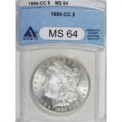 <B>1880-CC $1 MS64 ANACS.</B></I> NGC Census: (1988/1261). PCGS Population (3549/2378). Mintage: 591,000. Numismedia Wsl. Price for NGC/PCGS coin in MS64: $565. (#7100)<BR><BR><B>Coin Engraver:</B> George T. Morgan<BR><BR><b>Shipping:</b> Coins & Currency (<a target="_blank" href="http://www.heritageauctions.com/common/shipping.php">view shipping information</a>)