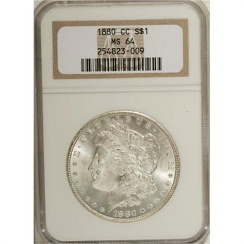 <B>1880-CC $1 MS64 NGC.</B></I> NGC Census: (1925/1222). PCGS Population (3491/2313). Mintage: 591,000. Numismedia Wsl. Price for NGC/PCGS coin in MS64: $565. (#7100)<BR><BR><b>Shipping:</b> Coins & Currency (<a target="_blank" href="http://www.heritageauctions.com/common/shipping.php">view shipping information</a>)