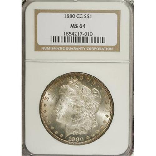 <B>1880-CC $1 MS64 NGC.</B></I> NGC Census: (1933/1227). PCGS Population (3491/2313). Mintage: 591,000. Numismedia Wsl. Price for NGC/PCGS coin in MS64: $565. (#7100)<BR><BR><b>Shipping:</b> Coins & Currency (<a target="_blank" href="http://www.heritageauctions.com/common/shipping.php">view shipping information</a>)