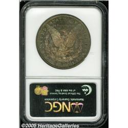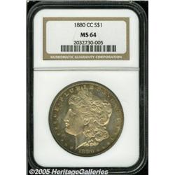 <B>1880-CC<img border='0' src='http://www.heritagecoins.com/images/star.gif' width=10 height=10>$1 MS64 NGC.</B></I> Peripheral russet and cobalt-blue patina is joined by touches of magenta toning in the central reverse. Adequately struck, and a few minute grade-defining marks on the obverse.