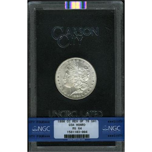 <B>1880-CC $1 MS64 NGC.</B></I> Lustrous and well struck, with essentially untoned snow-white surfaces that show a few superficial scuff marks. Still housed in the original hard plastic container that these Morgan dollars were encapsulated in by the GSA, in the 1970s. <BR><BR><B>Coin Engraver:</B> George T. Morgan<BR><BR><b>Shipping:</b> Coins & Currency (<a target="_blank" href="http://www.heritageauctions.com/common/shipping.php">view shipping information</a>)