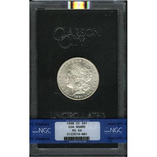 <B>1880-CC $1 MS64 NGC.</B></I> GSA Box Included. NGC Census: (2026/1268). PCGS Population (3600/2451). Mintage: 591,000. Numismedia Wsl. Price for NGC/PCGS coin in MS64: $565. (#7100)<BR><BR><B>Coin Engraver:</B> George T. Morgan<BR><BR><b>Shipping:</b> Coins & Currency (<a target="_blank" href="http://www.heritageauctions.com/common/shipping.php">view shipping information</a>)