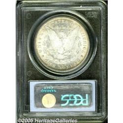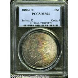 <B>1880-CC<img border='0' src='http://www.heritagecoins.com/images/star.gif' width=10 height=10>$1 MS64 PCGS.</B></I> Lustrous surfaces are covered by multicolored toning over most of the obverse, while the reverse shows light toning only at the rims.