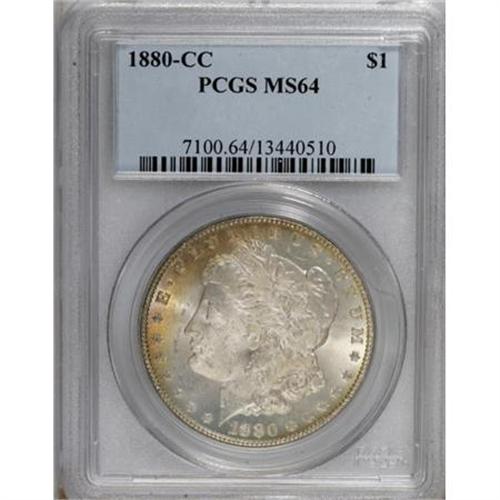 <B>1880-CC $1 MS64 PCGS.</B></I> PCGS Population (3548/2365). NGC Census: (1988/1261). Mintage: 591,000. Numismedia Wsl. Price for NGC/PCGS coin in MS64: $565. (#7100)<BR><BR><B>Coin Engraver:</B> George T. Morgan<BR><BR><b>Shipping:</b> Coins & Currency (<a target="_blank" href="http://www.heritageauctions.com/common/shipping.php">view shipping information</a>)