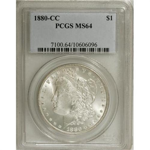 <B>1880-CC $1 MS64 PCGS.</B></I> PCGS Population (3548/2365). NGC Census: (1988/1261). Mintage: 591,000. Numismedia Wsl. Price for NGC/PCGS coin in MS64: $565. (#7100)<BR><BR><B>Coin Engraver:</B> George T. Morgan<BR><BR><b>Shipping:</b> Coins & Currency (<a target="_blank" href="http://www.heritageauctions.com/common/shipping.php">view shipping information</a>)