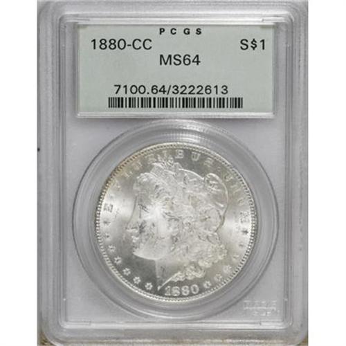 <B>1880-CC $1 MS64 PCGS.</B></I> . PCGS Population (3618/2472). NGC Census: (2042/1291). Mintage: 591,000. Numismedia Wsl. Price for NGC/PCGS coin in MS64: $555. (#7100)<BR><BR><B>Coin Engraver:</B> George T. Morgan<BR><BR><b>Shipping:</b> Coins & Currency (<a target="_blank" href="http://www.heritageauctions.com/common/shipping.php">view shipping information</a>)