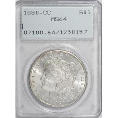 <B>1880-CC $1 MS64 PCGS.</B></I> . PCGS Population (3618/2472). NGC Census: (2040/1291). Mintage: 591,000. Numismedia Wsl. Price for NGC/PCGS coin in MS64: $555. (#7100)<BR><BR><B>Coin Engraver:</B> George T. Morgan<BR><BR><b>Shipping:</b> Coins & Currency (<a target="_blank" href="http://www.heritageauctions.com/common/shipping.php">view shipping information</a>)