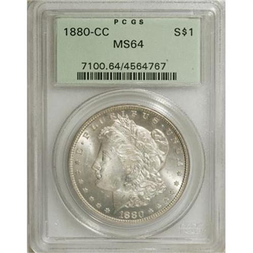 <B>1880-CC $1 MS64 PCGS.</B></I> . PCGS Population (3626/2491). NGC Census: (2047/1293). Mintage: 591,000. Numismedia Wsl. Price for NGC/PCGS coin in MS64: $555. (#7100)<BR><BR><B>Coin Engraver:</B> George T. Morgan<BR><BR><b>Shipping:</b> Coins & Currency (<a target="_blank" href="http://www.heritageauctions.com/common/shipping.php">view shipping information</a>)