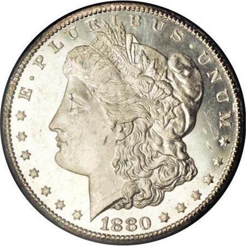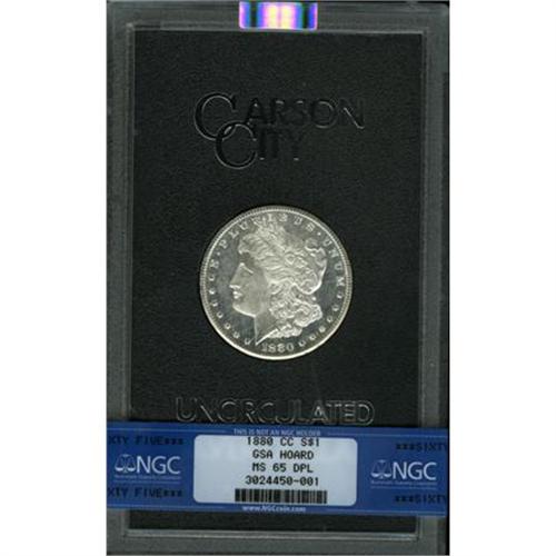 <B>1880-CC $1 8 Over High 7 MS65 Deep Mirror Prooflike NGC.</B></I> VAM-5. A Top 100 Variety. The present lot is the <I>only</B></I> 1880-CC GSA dollar of <I>any</B></I> variety that has been graded MS65 Deep Mirror Prooflike by NGC, with none finer. It is a gleaming Gem with amazing contrast, band-certified in the original plastic case, that offers impressive contrast between moderately frosted, decisively struck devices and powerfully reflective fields. Light silver-gray haze with undercurrents of champagne drapes each side, but this has little effect on the contrast. Incredibly appealing and desirable.<BR><BR><b>Shipping:</b> Coins & Currency (<a target="_blank" href="http://www.heritageauctions.com/common/shipping.php">view shipping information</a>)