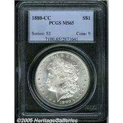 <B>1880-CC<img border='0' src='http://www.heritagecoins.com/images/star.gif' width=10 height=10>$1 MS65 PCGS.</B></I> Sharply struck and highly lustrous, with a thick layer of mint frost over both sides. Struck from mildly rotated dies, and showing a few wispy luster grazes on the obverse.