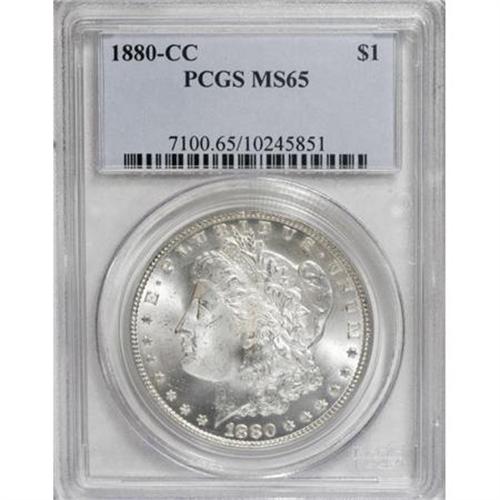 <B>1880-CC $1 MS65 PCGS.</B></I> This virtually brilliant Gem has pleasing luster and a splendidly smooth reverse. The slight softness of strike in the centers is typical for the popular Carson City issue.<BR><BR><b>Shipping:</b> Coins & Currency (<a target="_blank" href="http://www.heritageauctions.com/common/shipping.php">view shipping information</a>)