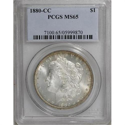 <B>1880-CC $1 MS65 PCGS.</B></I> PCGS Population (1814/513). NGC Census: (912/341). Mintage: 591,000. Numismedia Wsl. Price for NGC/PCGS coin in MS65: $1,175. (#7100)<BR><BR><B>Coin Engraver:</B> George T. Morgan<BR><BR><b>Shipping:</b> Coins & Currency (<a target="_blank" href="http://www.heritageauctions.com/common/shipping.php">view shipping information</a>\)