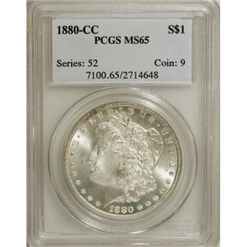 <B>1880-CC $1 MS65 PCGS.</B></I> PCGS Population (1814/513). NGC Census: (912/341). Mintage: 591,000. Numismedia Wsl. Price for NGC/PCGS coin in MS65: $1,175. (#7100)<BR><BR><B>Coin Engraver:</B> George T. Morgan<BR><BR><b>Shipping:</b> Coins & Currency (<a target="_blank" href="http://www.heritageauctions.com/common/shipping.php">view shipping information</a>\)