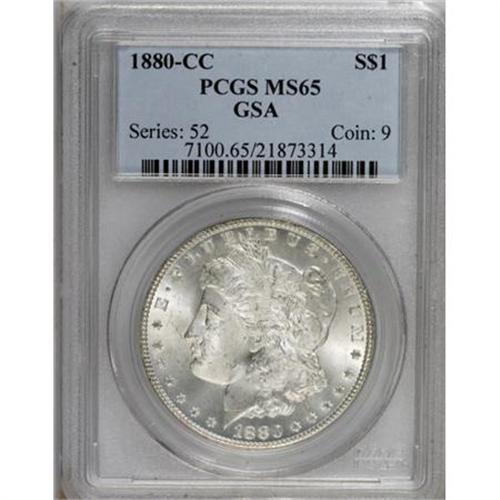 <B>1880-CC $1 MS65 PCGS.</B></I> Ex: GSA. This essentially brilliant Gem has scintillating luster and good eye appeal. The hair above the ear lacks definitive detail, but this is generally the case for this scarcer GSA issue.<BR><BR><B>Coin Engraver:</B> George T. Morgan<BR><BR><b>Shipping:</b> Coins & Currency (<a target="_blank" href="http://www.heritageauctions.com/common/shipping.php">view shipping information</a>)