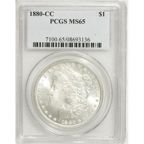 <B>1880-CC $1 MS65 PCGS.</B></I> Crisply struck with swirling luster and a touch of frost. A hint of delicate rouge patina visits the centers on this well-preserved and enticing Carson City dollar.<BR><BR><B>Coin Engraver:</B> George T. Morgan<BR><BR><b>Shipping:</b> Coins & Currency (<a target="_blank" href="http://www.heritageauctions.com/common/shipping.php">view shipping information</a>)