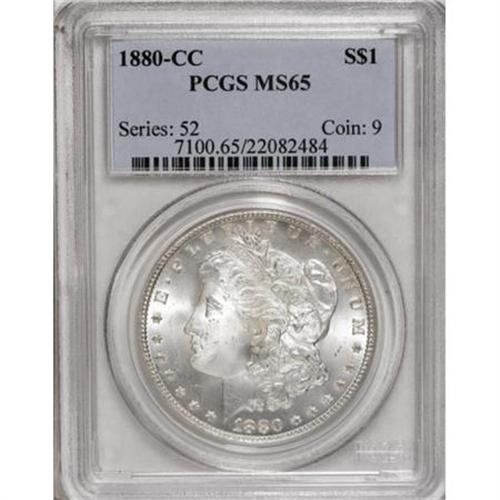 <B>1880-CC $1 MS65 PCGS.</B></I> Strong, swirling luster and hints of frost on the well-defined devices are the major merits of this lovely Carson City dollar. An attractively preserved survivor from this lower-mintage issue.<BR><BR><B>Coin Engraver:</B> George T. Morgan<BR><BR><b>Shipping:</b> Coins & Currency (<a target="_blank" href="http://www.heritageauctions.com/common/shipping.php">view shipping information</a>)