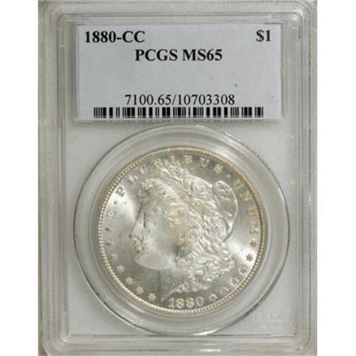 <B>1880-CC $1 MS65 PCGS.</B></I> A bright and untoned Gem that reveals just a few minor grazes. Somewhat softly struck in the centers. <BR><BR><B>Coin Engraver:</B> George T. Morgan<BR><BR><b>Shipping:</b> Coins & Currency (<a target="_blank" href="http://www.heritageauctions.com/common/shipping.php">view shipping information</a>)