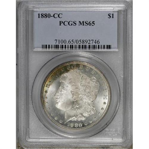 <B>1880-CC $1 MS65 PCGS.</B></I> Though the central devices show a touch of softness, this Carson City Morgan dollar offers impressive overall eye appeal. Richly frosted devices and nearby fields show scattered silver-gray haze, while the upper left obverse shows crescents of green-gold and sky-blue.<BR><BR><B>Coin Engraver:</B> George T. Morgan<BR><BR><b>Shipping:</b> Coins & Currency (<a target="_blank" href="http://www.heritageauctions.com/common/shipping.php">view shipping information</a>)