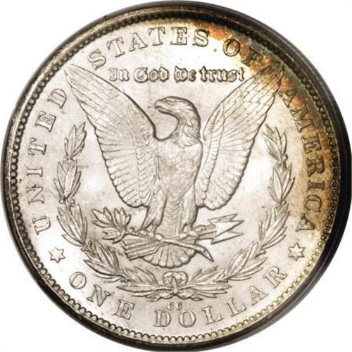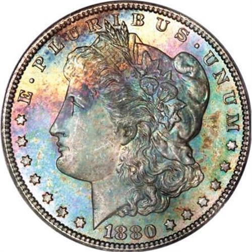 <B>1880-CC $1 MS65 PCGS.</B></I> Deep teal, lilac, and saffron patina coats the obverse, with a small crescent of champagne-pink near the reverse rim. A boldly lustrous piece, despite the deep obverse toning, and distraction-free. Another coup for the color collectors.<BR><BR><B>Coin Engraver:</B> George T. Morgan<BR><BR><b>Shipping:</b> Coins & Currency (<a target="_blank" href="http://www.heritageauctions.com/common/shipping.php">view shipping information</a>)