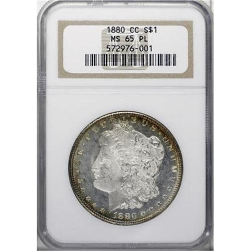 <B>1880-CC $1 MS65 Prooflike NGC.</B></I> Slivers of golden-brown, cobalt-blue, and lavender patination hug the margins of this Prooflike Gem. The design elements are reasonably defined, and stand out against the semi-mirrored fields. A few unobtrusive luster grazes possibly prevent an even finer grade.<BR><BR><B>Coin Engraver:</B> George T. Morgan<BR><BR><b>Shipping:</b> Coins & Currency (<a target="_blank" href="http://www.heritageauctions.com/common/shipping.php">view shipping information</a>)
