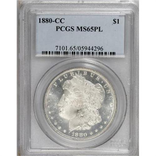 <B>1880-CC $1 MS65 Prooflike PCGS.</B></I> The silver-gray surfaces of this Prooflike Gem offer well struck motifs, which also provide excellent contrast with the mirrored fields. A few grade consistent marks are present on the obverse.<BR><BR><B>Coin Engraver:</B> George T. Morgan<BR><BR><b>Shipping:</b> Coins & Currency (<a target="_blank" href="http://www.heritageauctions.com/common/shipping.php">view shipping information</a>)